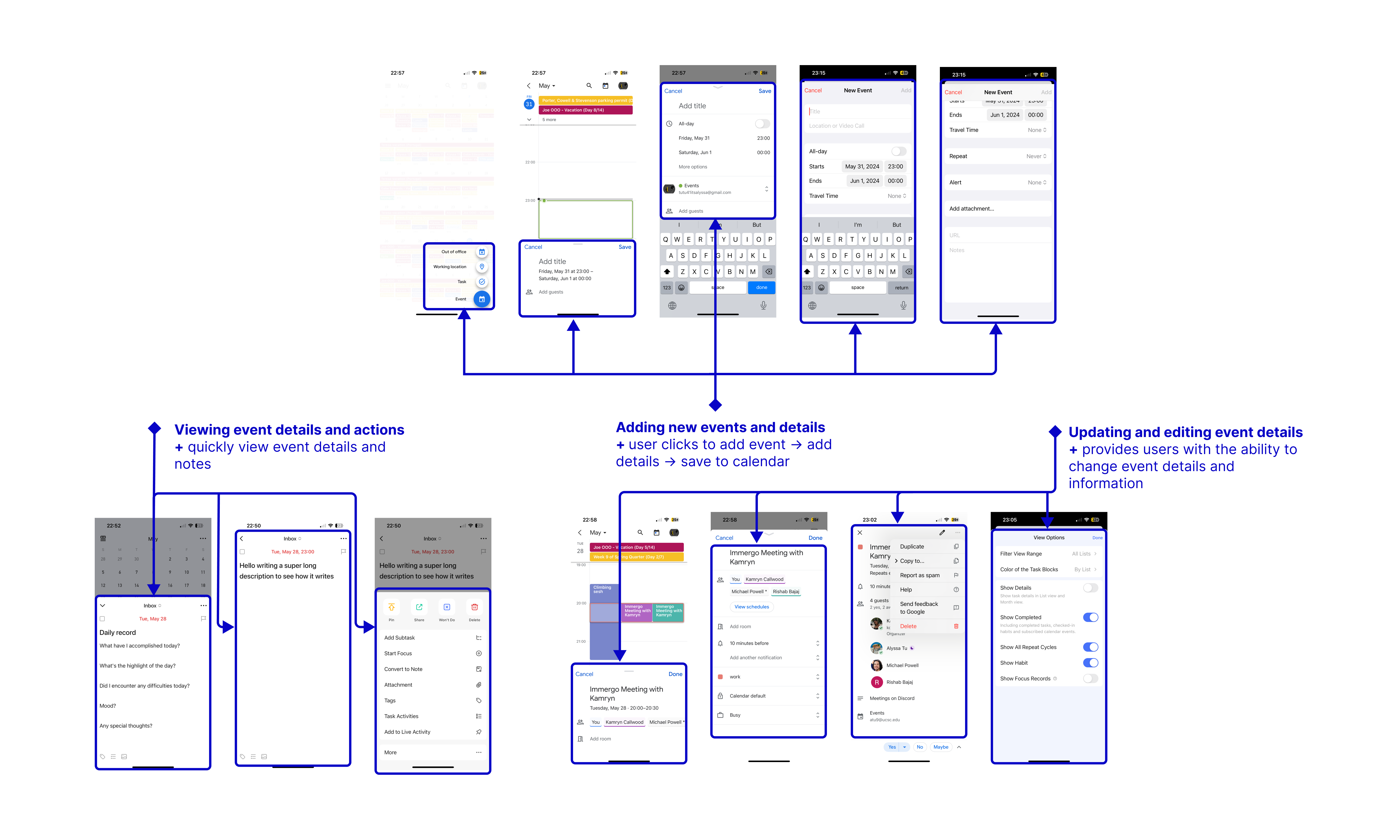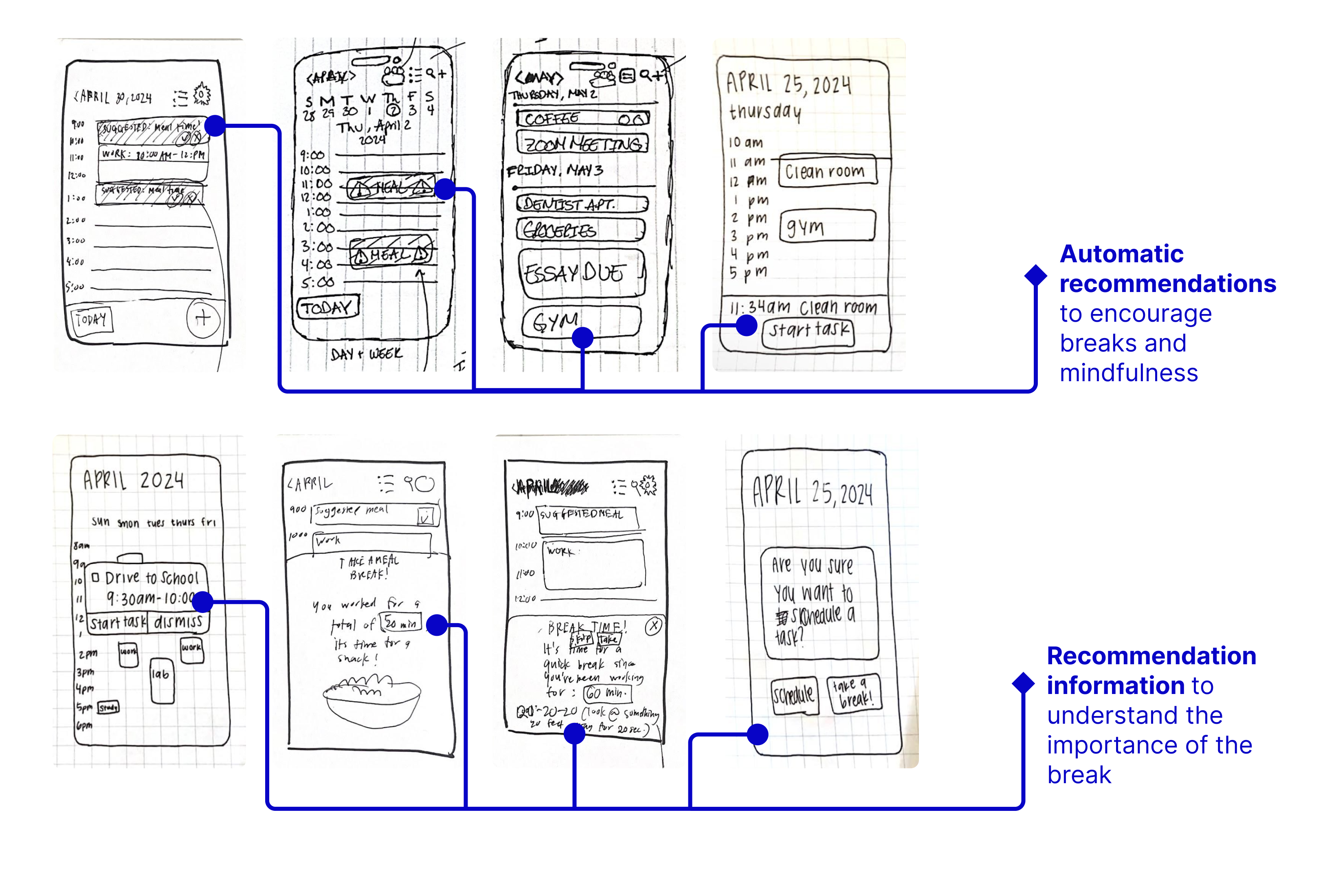 Our main goal with our app was to focus on improving a student work-life balance. To understand how people manage time with apps, we analyzed key features and requirements of commonly used time management, focus, and productivity apps like Google Calendar, Apple Calendar, Apple Fitness, TickTick, and Flow.
